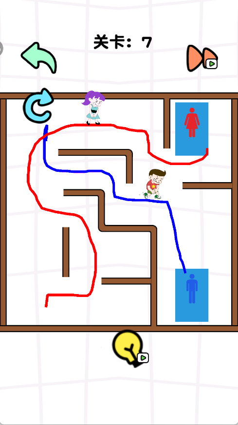 1、玩家化身画线侠,为被红绳、黑绳困住的尿急男女画出路线,助他们冲向专属厕所。